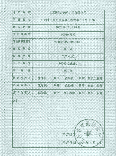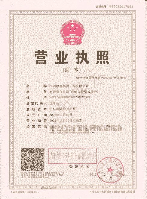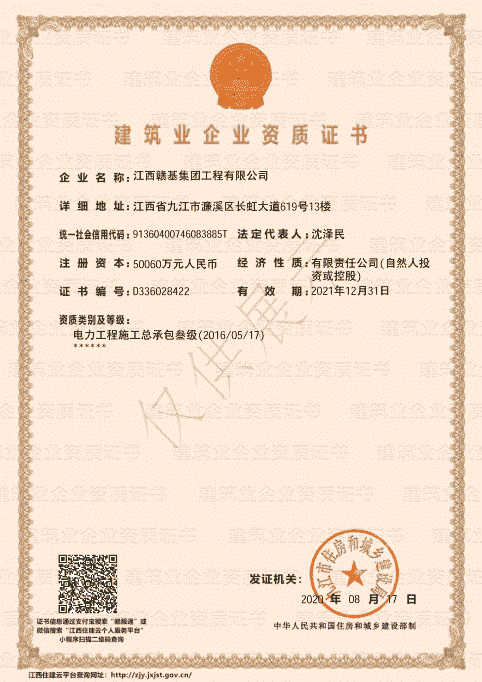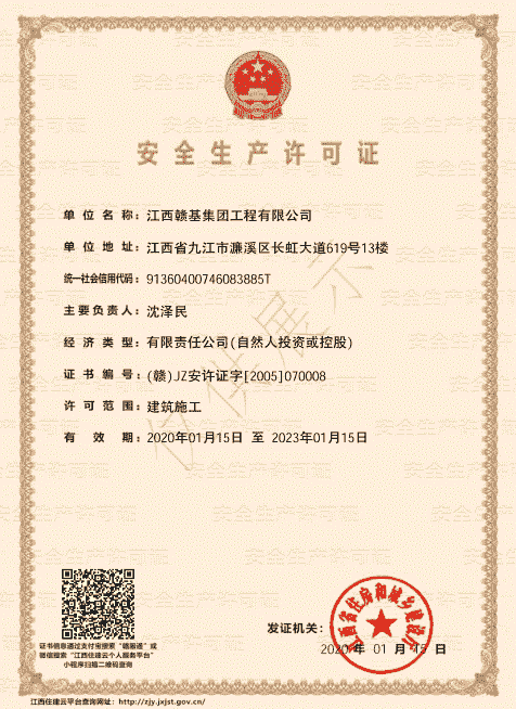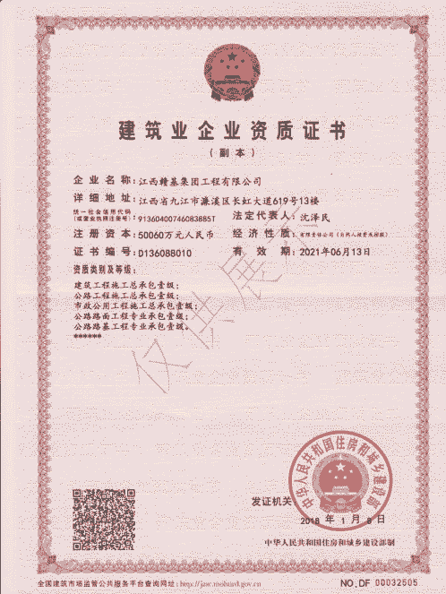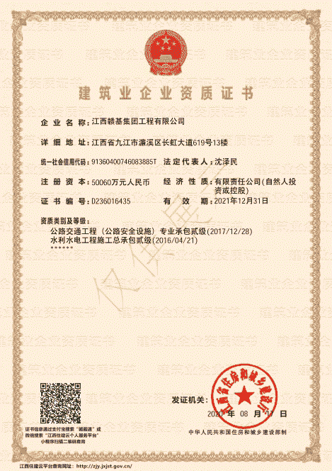 江西贛基集團(tuán)工程有限公司是國(guó)家壹級(jí)施工總承包企業(yè),具有公路工程、市政公用工程、房屋建筑工程總承包壹級(jí)資質(zhì);公路路基、路面專業(yè)壹級(jí);水利水電工程、電力工程、城市園林綠化、公路養(yǎng)護(hù)工程貳級(jí)資質(zhì)。